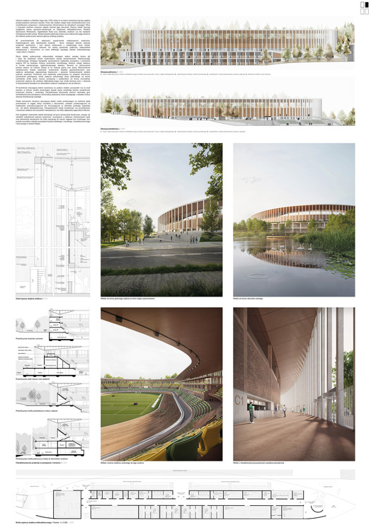 Za płynne i organiczne wkomponowanie struktury w istniejącą przestrzeń wokół stadionu. Zastosowanie drewna w konstrukcji i wewnętrznej strukturze obiektu oraz gabionowej struktury wykorzystującej odzyskiwane z istniejącego obiektu kruszywo rozbiórkowe dobrze wpisuje się we współczesne myślenie ekologiczne.