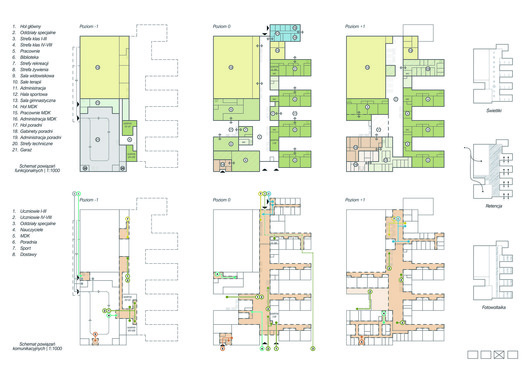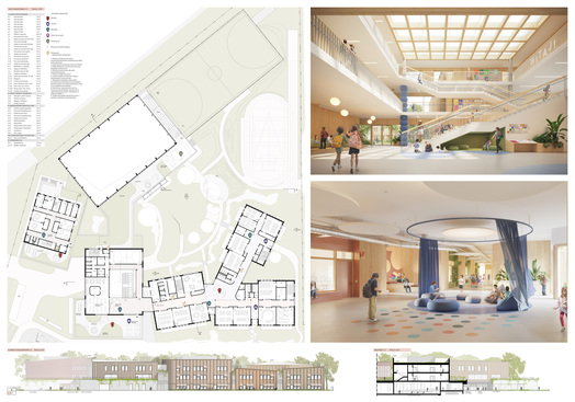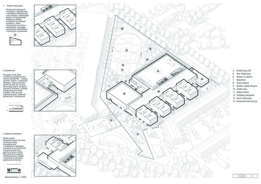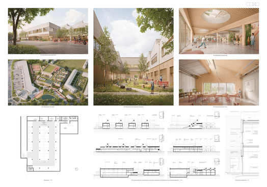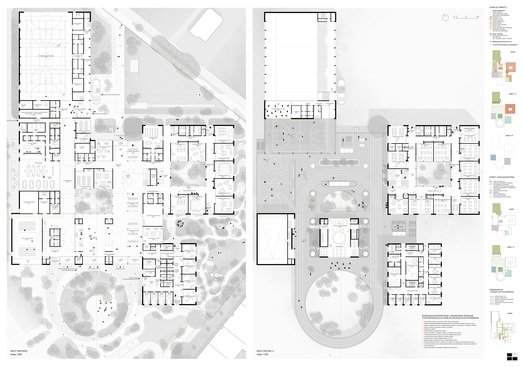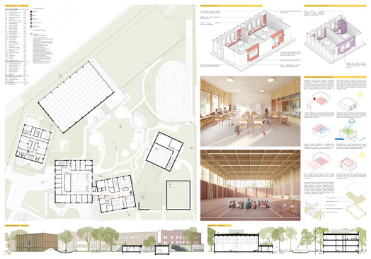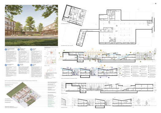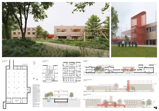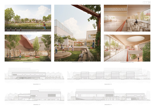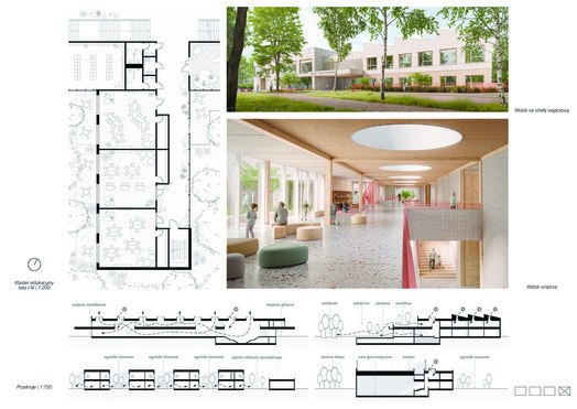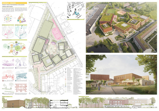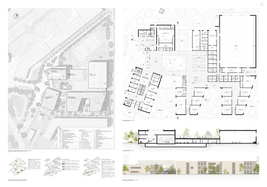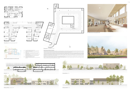 Uwagę sądu konkursowego zwróciła wrażliwość kształtowania przestrzeni w oparciu o potrzeby dzieci oraz atrakcyjność terenu zielonego w środku założenia. Wątpliwość Sądu Konkursowego wzbudziła znaczna odległość (i dostępność) poradni i szkolnych pomieszczeń terapii od oddziałów nauczania specjalnego.
