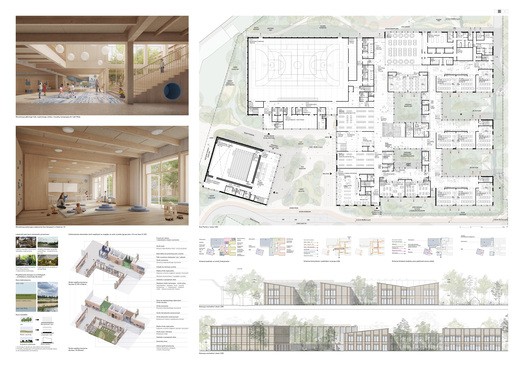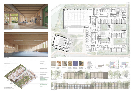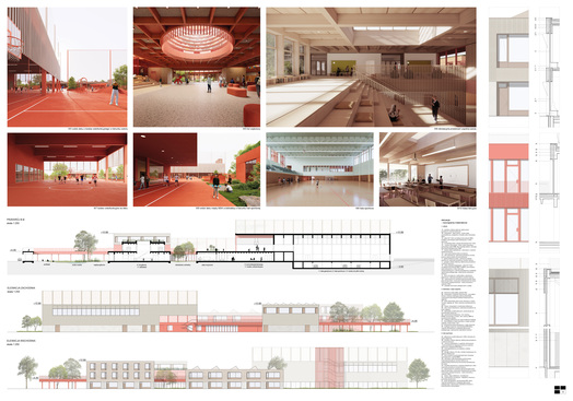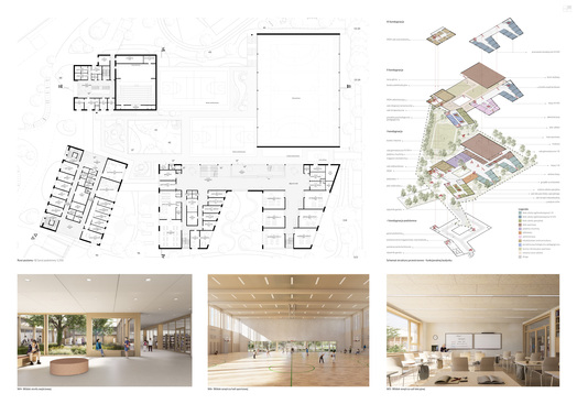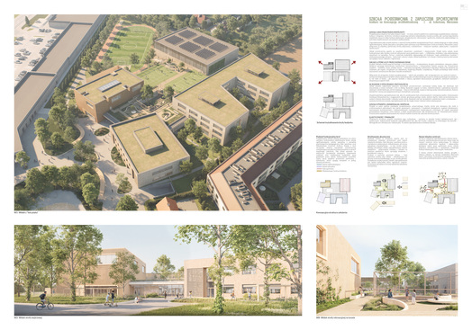 Praca otrzymuje wyróżnienie ze względu na dobre rozwiązanie urbanistyczne - ukształtowanie strefy wejścia przed budynkiem, która w sposób płynny przekształca się w atrakcyjny hol wejściowy. O ile autorzy poświęcili dużo uwagi na rozwiązania urbanistyczne i budynkowe o tyle nie wykazali przekonujących rozwiązań dedykowanych uczniom. Wątpliwości budzi m.in. relatywnie duże oddalenie od wejścia zespołu szatni, niedoświetlenie rekreacji w skrzydłach szkolnych oraz odległość świetlic od wejścia (jedna z nich na kondygnacji 2.
