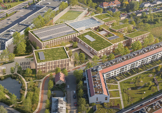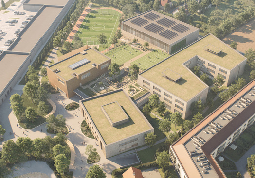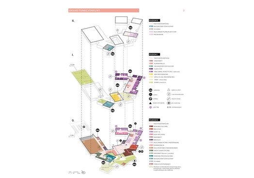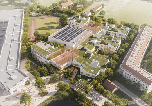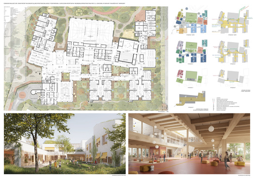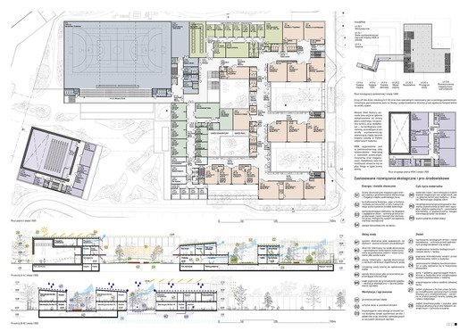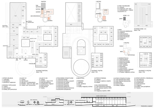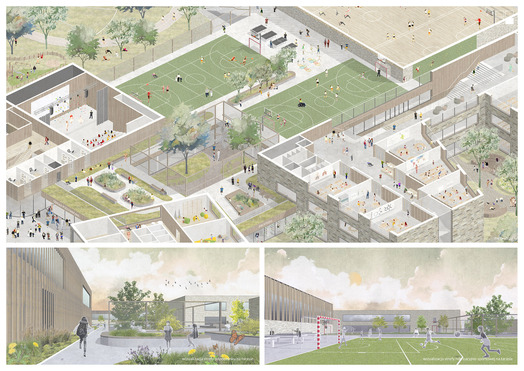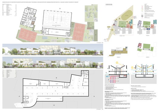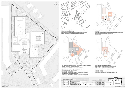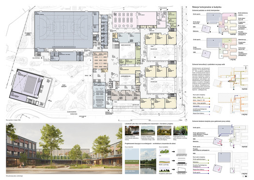 Zaproponowany został zasadniczo zwarty i efektywny układ komunikacyjny, przestrzenie rekreacyjne wewnątrz budynku są doświetlone. Dużym atutem pracy jest również rozwiązanie zewnętrznych przestrzeni wspólnych na tarasach. Wątpliwości sądu budzi relatywnie mało przestrzeni zielonej dla uczniów, w szczególności w wąskim dziedzińcu zrealizowanym od północy. Deklaracja stworzenia lokalnego centrum życia społecznego nie odzwierciedla się w rozwiązaniach projektowych np. wejście do MDK jest mało widoczne.