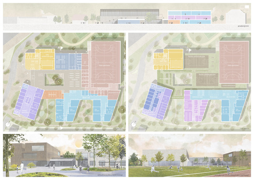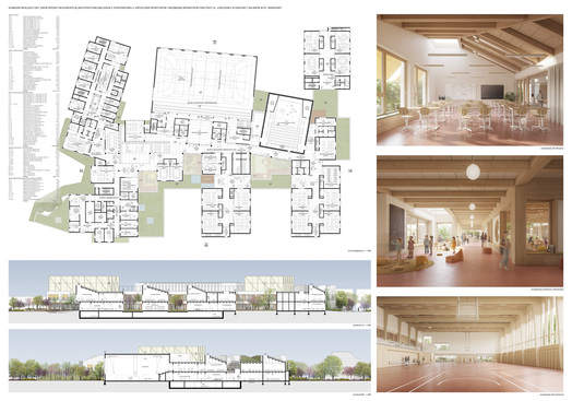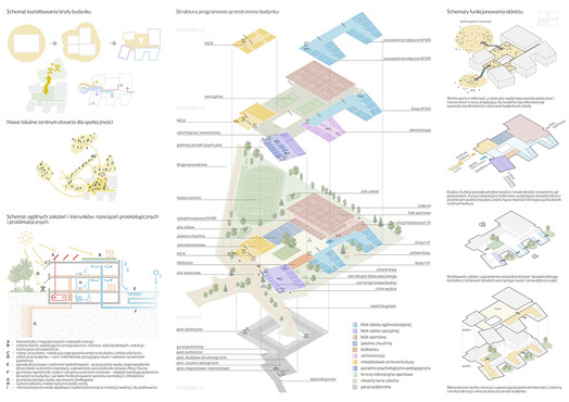 Strefa sportu i rekreacji miała uwzględniać halę sportową z możliwością odbywania imprez sportowo-kulturalno-oświatowych i spotkań grupowych oraz dwie sale gimnastyczne. Rozwiązania dla obiektów pełniących funkcje dodatkowe miały stawarzać powiązanie funkcjonalnie z kompleksem oświatowym, ale również umożliwiać samodzielne funkcjonowanie np. poza godzinami pracy szkoły. Stąd MDK i poradnię psychologiczno-pedagogiczną należało wyposażyć w osobne wejścia.