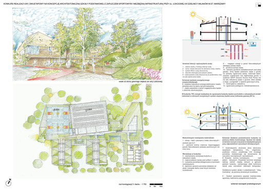 Praca w najlepszy sposób spełnia oczekiwania Zamawiającego pod względem rozwiązań urbanistycznych, zagospodarowania terenu, jak i funkcji oraz wyrazu architektonicznego obiektu. Atutem pracy jest bardzo czytelny układ brył i podział funkcji. Umożliwiono równorzędny dostęp do projektowanej szkoły zarówno od ulicy Sytej, jak i Łokciowej.