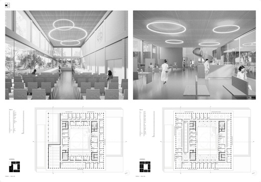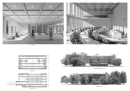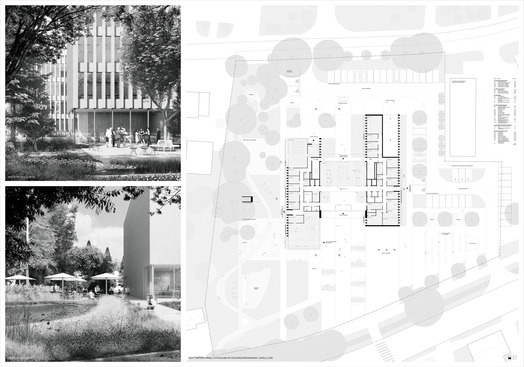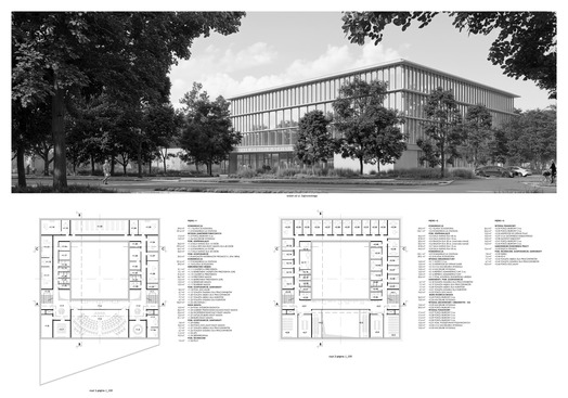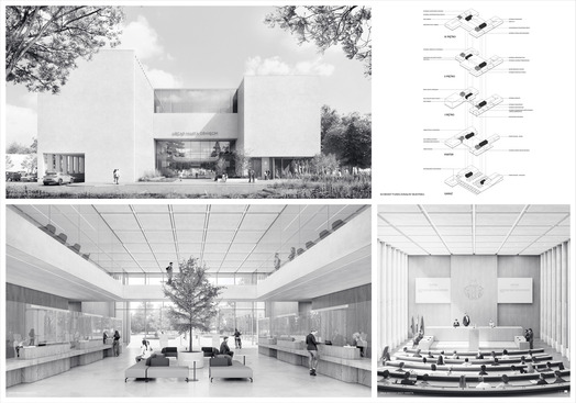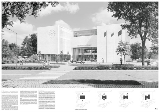 Za propozycję czytelnej i indywidualnie ukształtowanej formy Ratusza, stanowiącej istotną dominantę urbanistyczną. Zwraca uwagę atrakcyjna przestrzeń obsługi interesantów, dostępna z różnych kierunków. Wątpliwości Sądu Konkursowego wzbudziły rozwiązania komunikacyjne wewnątrz budynku, w tym dostępność strefy Sali Rady Miasta.