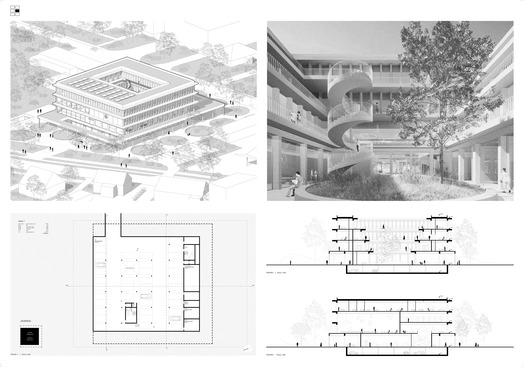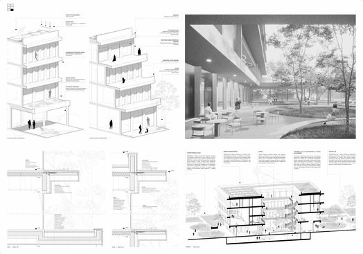 Za otwarty i przyjazny wyraz architektoniczny obiektu opartego na podcieniu okalającym całą bryłę oraz próbę wytworzenia interesującej przestrzeni wewnętrznego patio z sekwencję schodkowych tarasów umożliwiających korzystniejsze doświetlenie.