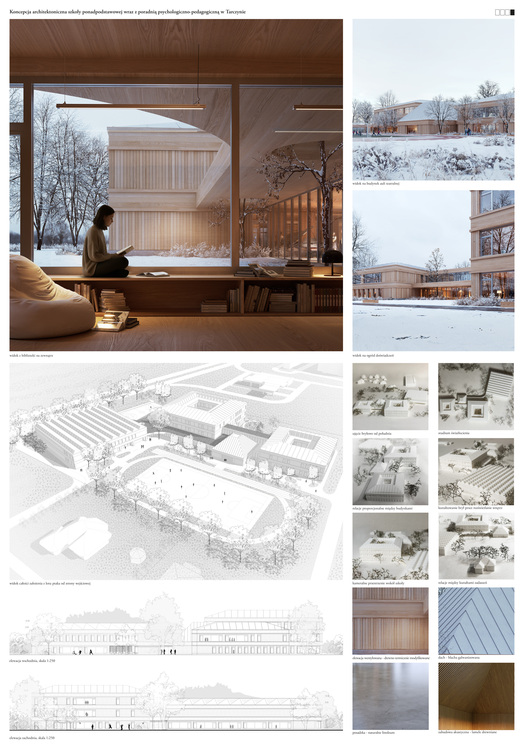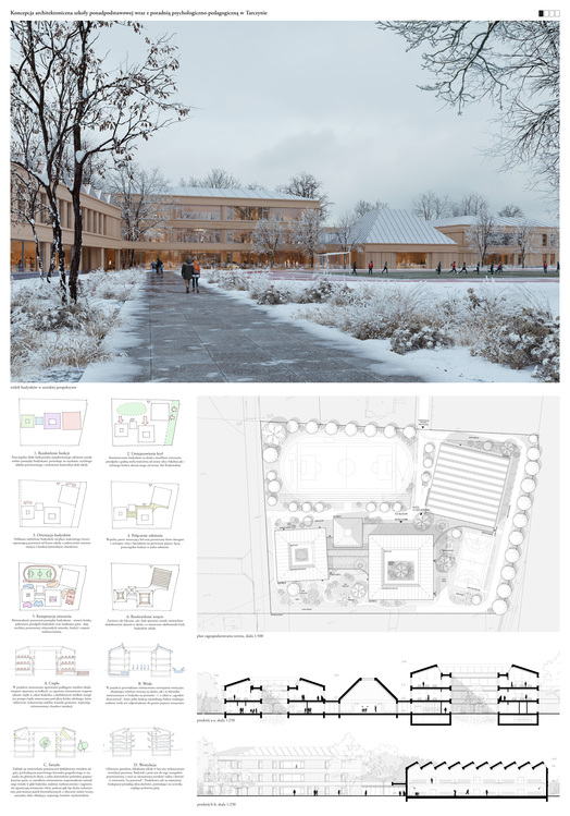 Nagrodzona praca opiera się na strategii stworzenia kampusu edukacyjnego, ogniskującego życie okolicy oraz będącego charakterystycznym elementem zabudowy Tarczyna. Poprzez układ brył oraz sposób ukształtowania komunikacji na terenie inwestycji praca nawiązuje do układu urbanistycznego i okrężnego przebiegu ul. Pogodnej zawartego w założeniach planistycznych. Centralnym elementem proponowanego zespołu, urbanistycznym wnętrzem, na które otwierają się wszystkie bryły, jest główne boisko z bieżnią. Taka lokalizacja oraz nadana w jej konsekwencji ranga przestrzenna boiska, podkreśla integracyjną rolę sportu i aktywności fizycznej tak w życiu szkoły jak i lokalnej społeczności zapraszając do uczestnictwa. Jednocześnie zapewnienie izolacji boiska od ciągu al. Krakowskiej poprzez odpowiednie ukształtowanie zabudowy osłania miejsce aktywności fizycznej od wpływu zanieczyszczeń i uciążliwości generowanych przez arterię komunikacyjną
