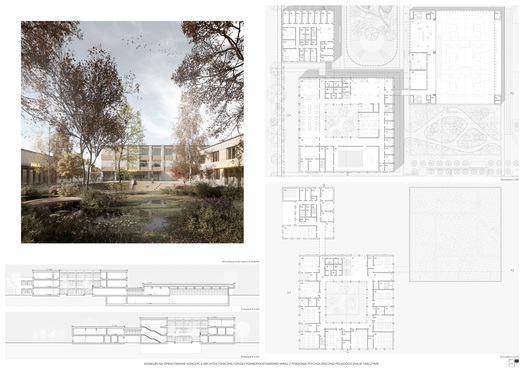 Autorzy pracy zaproponowali atrakcyjny podział na trzy bryły – funkcję dydaktyczną, poradnię i część sportową. Projekt wyróżnia się placem wejściowym o wysokich walorach architektonicznych, który spaja wszystkie funkcje placówki podkreślając, że tworzy główną przestrzeń całego założenia. Jury zwróciło uwagę na przemyślany, bogaty program przyrodniczy placu pozwalający na zagospodarowanie wód opadowych.