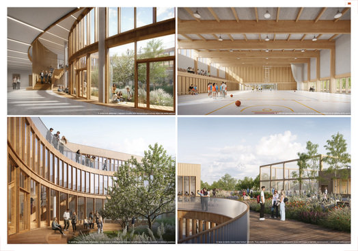 Zaproponowany budynek szkoły o zwartej formie, na planie kwadratu, od strony wschodniej – bryła sali sportowej. Projekt o czytelnym układzie przestrzennym i komunikacyjnym. Zwraca uwagę ciekawa propozycja okrągłego patio, tworzącego atrakcyjną przestrzeń integracji społeczności szkolnej. Forma okręgu została konsekwentnie zastosowana przez autorów dla podkreślenia istotnych przestrzeni szkoły. Projekt zawierał czytelne wyróżnienie strefy wejściowej do zespołu sportowego, co pozytywnie wpływało na przyszły komfort korzystania z tej strefy po godzinach pracy placówki.