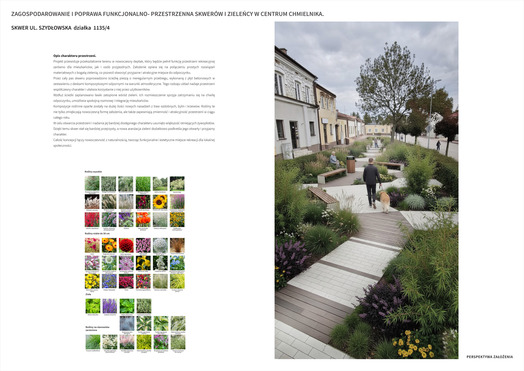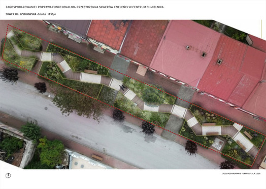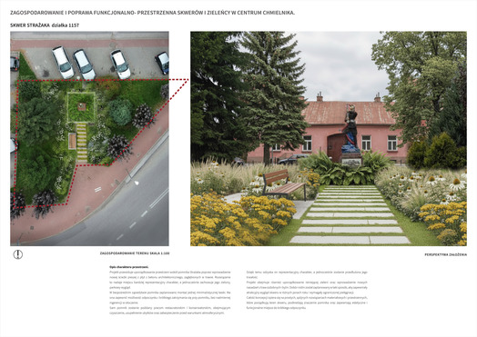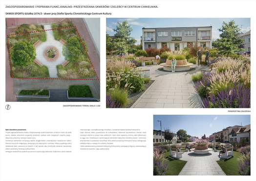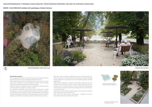 Przedmiotem konkursu zorganizowanego przez Gminę Chmielnik było opracowanie koncepcji zagospodarowania i poprawy funkcjonalno-przestrzennej skwerów i zieleńcy w centrum Chmielnika. Należało zaprojektować rewitalizację obszarów położonych łącznie na czterech działakach, w tym: