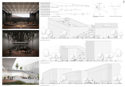 Za propozycję kształtowania fasady frontowej i strefy wejścia, a także ogólnie prawidłowe dyspozycje funkcjonalne. Sąd konkursowy zwrócił uwagę, że proponowana fasada wejściowa pozostaje jednak bez związku przestrzennego i strukturalnego z całością przestrzeni obiektu, co powoduje jego małą podatność na zmiany w dostosowaniu do wymagań funkcjonalnych i akustycznych.
