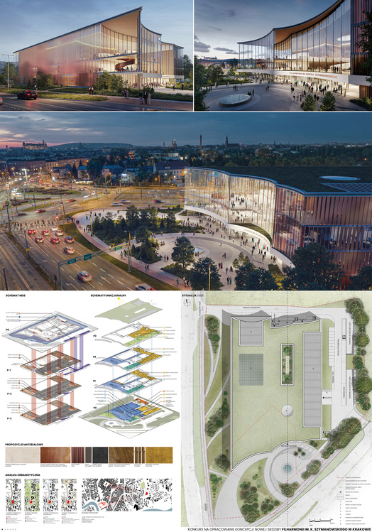Przedmiotem konkursu zorganizowanego przez Województwo Małopolskie przy wsparciu krakowskiego Oddziału SARP było pracowanie koncepcji nowej siedziby Filharmonii im. K. Szymanowskiego wraz z wewnętrznym układem komunikacyjnym i zagospodarowaniem terenu, zlokalizowanej w sąsiedztwie Ronda Grzegórzeckiego w Krakowie. Należało zaprojektować nowoczesny, nowatorski a zarazem ponadczasowy obiekt kultury odpowiadający współczesnym wymaganiom dla filharmonii. Kopncepcje budynku miały uwzględniać w sczególności: