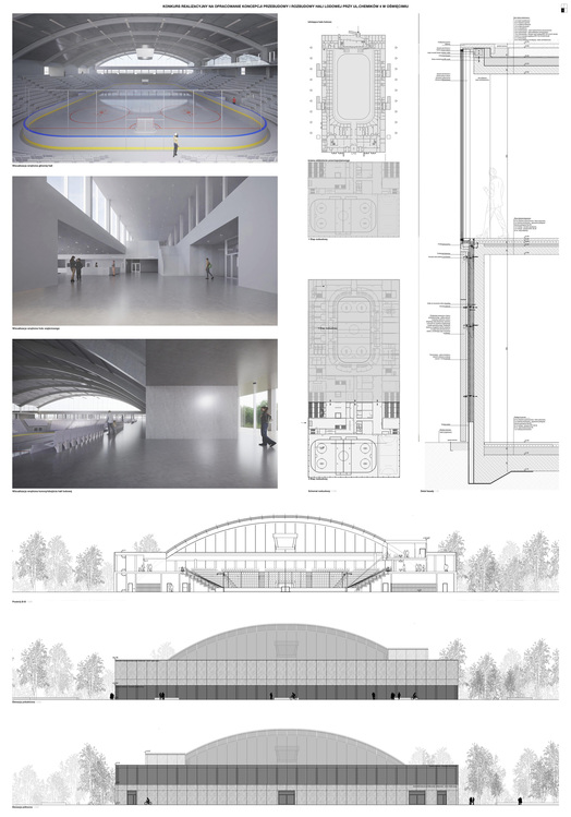 Wyróżnienie przyznano za zachowanie dominanty istniejącej hali lodowej, właściwą propozycję wyznaczenia wejścia do obiektu oraz czytelne etapowanie inwestycji.
