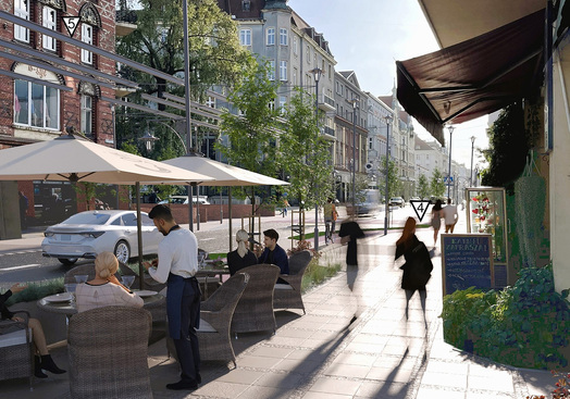 Doceniono schemat funkcjonalno-przestrzenny z rozwiązaniem komunikacji pieszej, rowerowej i kołowej (w tym publicznej), dzięki któremu odstąpiono od wydzielenia infrastruktury rowerowej. Powyższe pozwoliło na wprowadzenie stosunkowo dobrze rozmieszczonych pasów zieleni. Szerokie ciągi piesze umożliwiają ich odcinkowe zawężenie celem wygospodarowania miejsca dla ogródków kawiarnianych. Interesującą propozycją jest wybudowanie dwóch bliźniaczych budynków, tzw. „Okrąglaków” w rejonie DTŚ, nawiązujących do budynków historycznych, już nieistniejących. Miejsca szczególne w ciągu ulicy zostały podkreślone rozwieszonym pomiędzy słupami oświetleniem.
