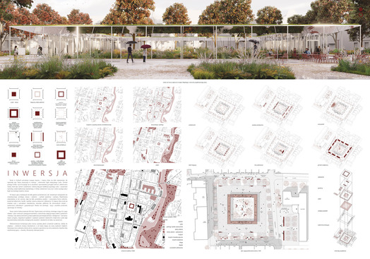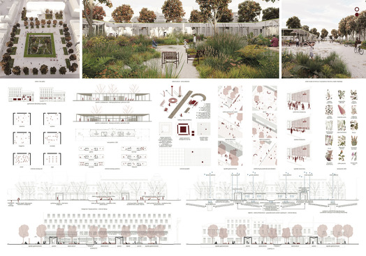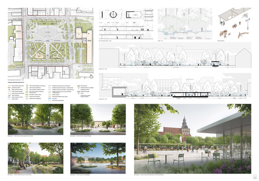 Praca Konkursowa otrzymała wyróżnienie za próbę urządzenia przestrzeni zielonej - oazy w centrum utwardzonego Placu Zwycięstwa.