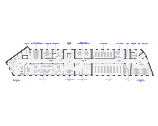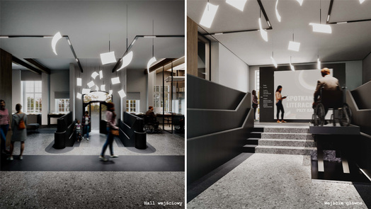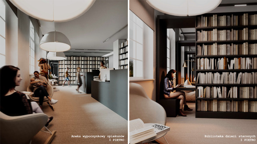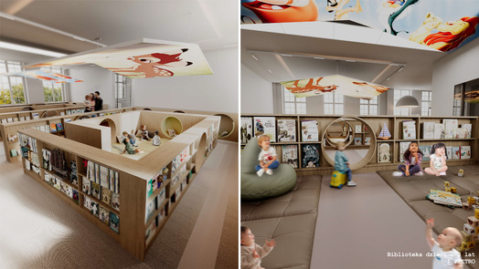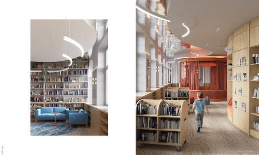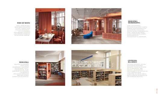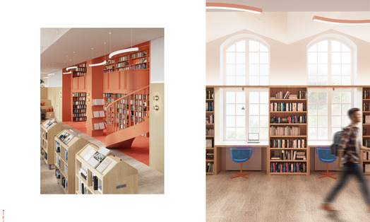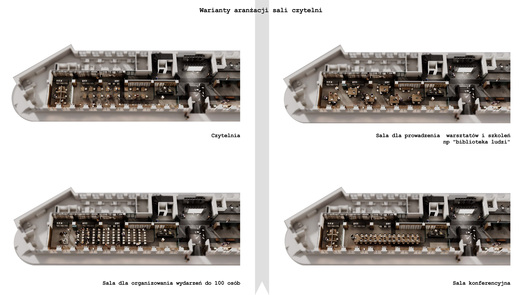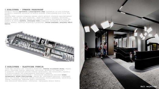 Ideą projektu koncepcyjnego jest stworzenie biblioteki jako nowoczesnego centrum kultury. Współczesna biblioteka powinna być przestrzenią wielofunkcyjną. Jej nowoczesna estetyka może czerpać inspiracje z lokalnych kodów kulturowych i symboli. Wielofunkcyjność wydzielonych stref umożliwia organizację spotkań, pracy zespołowej, kameralnych prelekcji oraz odczytów. Mobilność i przekształcalność części wyposażenia pozwalają na elastyczną zmianę aranżacji, dostosowaną do szerokiego programu instytucji.