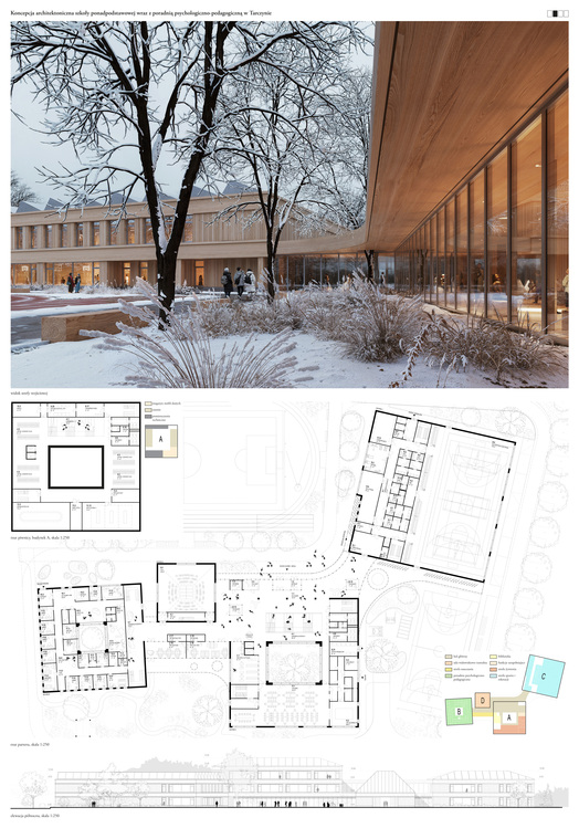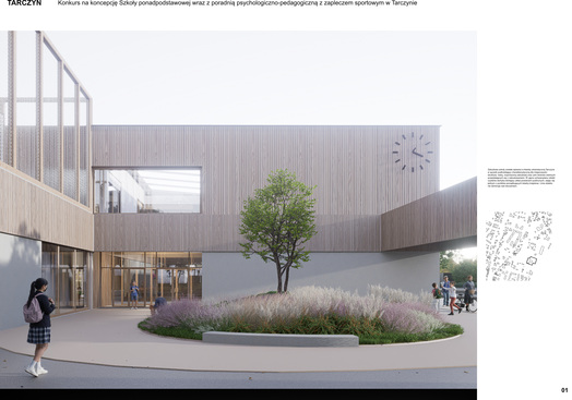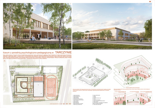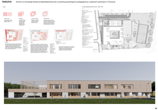 Nagrodzona praca opiera się na strategii stworzenia kampusu edukacyjnego, ogniskującego życie okolicy oraz będącego charakterystycznym elementem zabudowy Tarczyna. Poprzez układ brył oraz sposób ukształtowania komunikacji na terenie inwestycji praca nawiązuje do układu urbanistycznego i okrężnego przebiegu ul. Pogodnej zawartego w założeniach planistycznych. Centralnym elementem proponowanego zespołu, urbanistycznym wnętrzem, na które otwierają się wszystkie bryły, jest główne boisko z bieżnią. Taka lokalizacja oraz nadana w jej konsekwencji ranga przestrzenna boiska, podkreśla integracyjną rolę sportu i aktywności fizycznej tak w życiu szkoły jak i lokalnej społeczności zapraszając do uczestnictwa. Jednocześnie zapewnienie izolacji boiska od ciągu al. Krakowskiej poprzez odpowiednie ukształtowanie zabudowy osłania miejsce aktywności fizycznej od wpływu zanieczyszczeń i uciążliwości generowanych przez arterię komunikacyjną