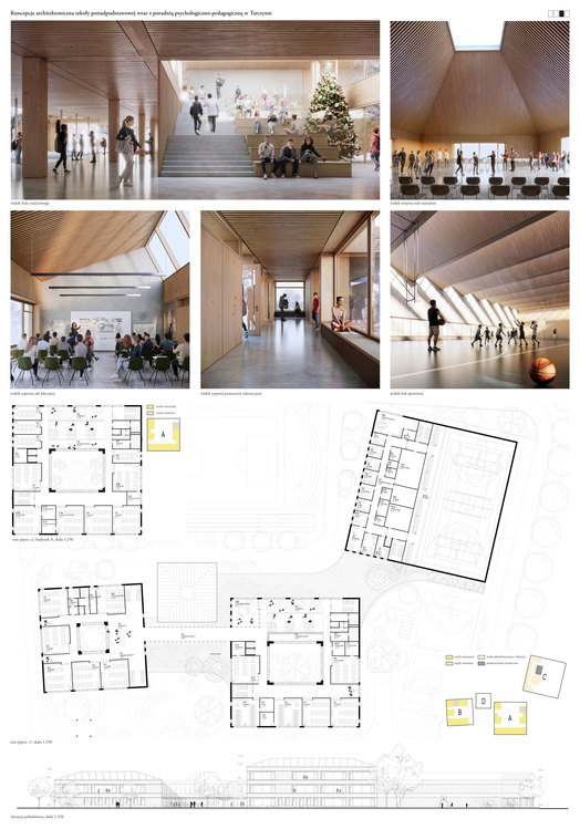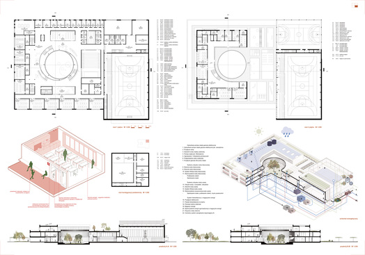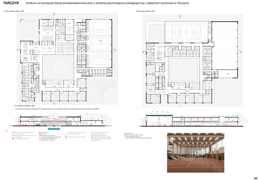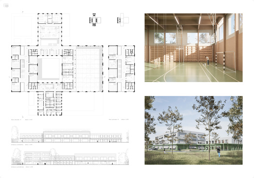 Zaproponowany budynek szkoły o zwartej formie, na planie kwadratu, od strony wschodniej – bryła sali sportowej. Projekt o czytelnym układzie przestrzennym i komunikacyjnym. Zwraca uwagę ciekawa propozycja okrągłego patio, tworzącego atrakcyjną przestrzeń integracji społeczności szkolnej. Forma okręgu została konsekwentnie zastosowana przez autorów dla podkreślenia istotnych przestrzeni szkoły. Projekt zawierał czytelne wyróżnienie strefy wejściowej do zespołu sportowego, co pozytywnie wpływało na przyszły komfort korzystania z tej strefy po godzinach pracy placówki.