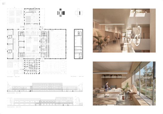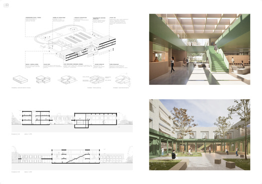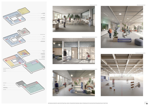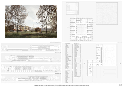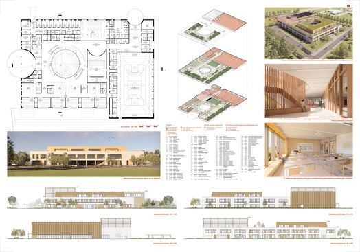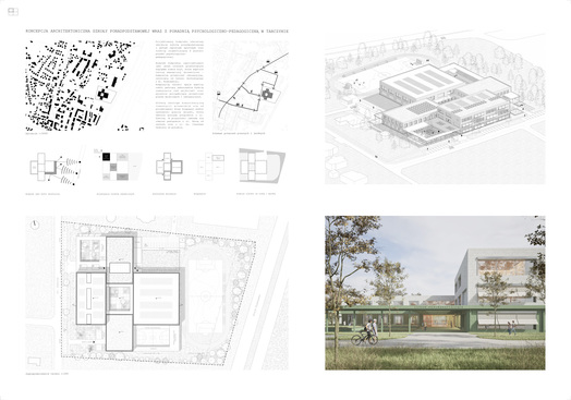 Autorzy pracy zaproponowali atrakcyjny podział na trzy bryły – funkcję dydaktyczną, poradnię i część sportową. Projekt wyróżnia się placem wejściowym o wysokich walorach architektonicznych, który spaja wszystkie funkcje placówki podkreślając, że tworzy główną przestrzeń całego założenia. Jury zwróciło uwagę na przemyślany, bogaty program przyrodniczy placu pozwalający na zagospodarowanie wód opadowych.