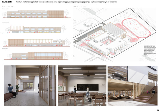 Projektowana szkoła to zespół 4 brył zorganizowanych wokół wewnętrznego dziedzińca. Architektura zespołu jest lekka i zapraszająca. Wejście główne zlokalizowano od strony narożnika północno-zachodniego, poprzez plac wejściowy otoczony pergolą. Układ przestrzenny obiektu jest czytelny, ułatwiający orientację, poszczególne skrzydła mieszczą czytelnie wydzielone strefy funkcjonalne. Jednocześnie podział na bryły umożliwia obniżenie skali zabudowy i zbliżenie jej do skali zabudowy Tarczyna.