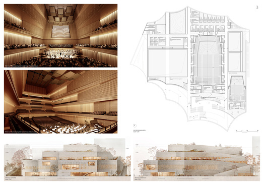 Za propozycję kształtowania fasady frontowej i strefy wejścia, a także ogólnie prawidłowe dyspozycje funkcjonalne. Sąd konkursowy zwrócił uwagę, że proponowana fasada wejściowa pozostaje jednak bez związku przestrzennego i strukturalnego z całością przestrzeni obiektu, co powoduje jego małą podatność na zmiany w dostosowaniu do wymagań funkcjonalnych i akustycznych.