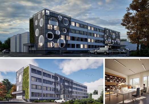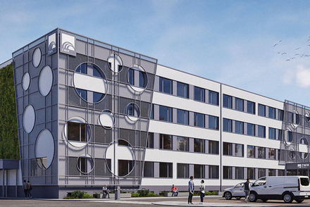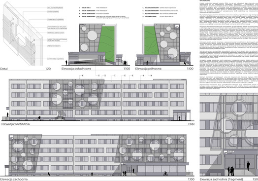 Za umiejętne połączenie nowoczesnych rozwiązań estetycznych z uwzględnieniem istniejącej struktury obiektu. Projekt w czytelny sposób wzmacnia tożsamość spółki, wykorzystując motywy inspirowane wodą oraz spójną kolorystykę nawiązującą do identyfikacji wizualnej firmy. Szczególnie wartościowym elementem jest zastosowanie „drugiej” elewacji z siatki cięto-ciągnionej, która nadaje budynkowi indywidualny charakter i lekkość dzieląc budynek na sekcje, wizualnie zmieniając jego proporcje. Istotnym atutem koncepcji jest wprowadzenie błękitno-zielonej infrastruktury na elewacjach szczytowych, co podkreśla proekologiczne podejście projektantów i przeciwdziała zmianom klimatu. Uporządkowanie strefy wejściowej oraz czytelne zaakcentowanie głównego wejścia znacząco podnosi funkcjonalność budynku i jakość jego odbioru.